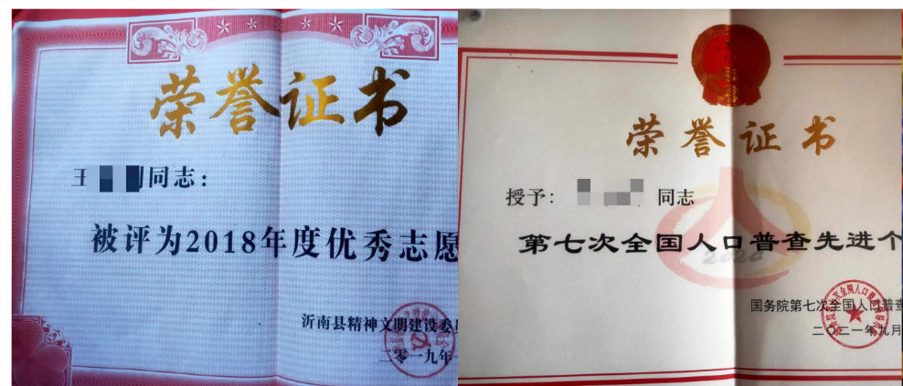 后來又響應國家號召開展人口普查活動,在政府和鄉鎮的支持下,做出了不錯的成績。2021年獲得第七次全國人口普查先進個人的獎項,在農村我算是把手機電腦學得比較順的,公益事業和志愿活動不僅提高我的個人能力,更重要的是我認為我的付出能對社會做出貢獻,能夠幫助到他人。周圍同事和朋友的支持與認可,甚至周邊的村民對我的認可,這讓我特別高興,也特別愿意繼續開展這個公益事業。