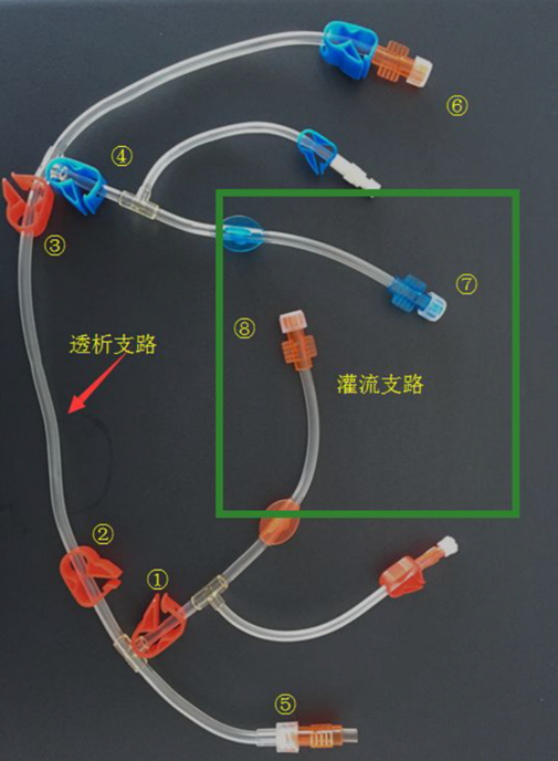 3、明細了夾子和端口顏色:白色是透析支路夾;紅藍是灌流路夾;黃色代表廢液袋夾。