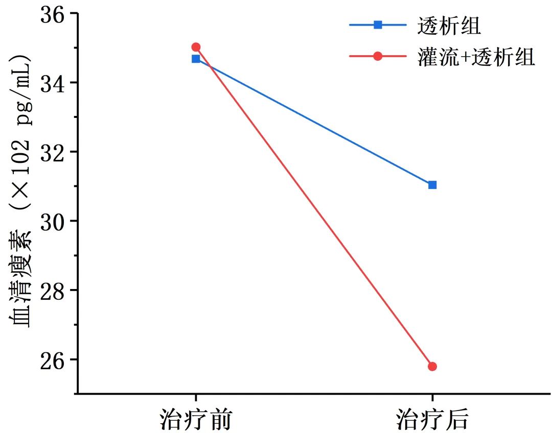 圖3 治療前后患者血清瘦素水平變化