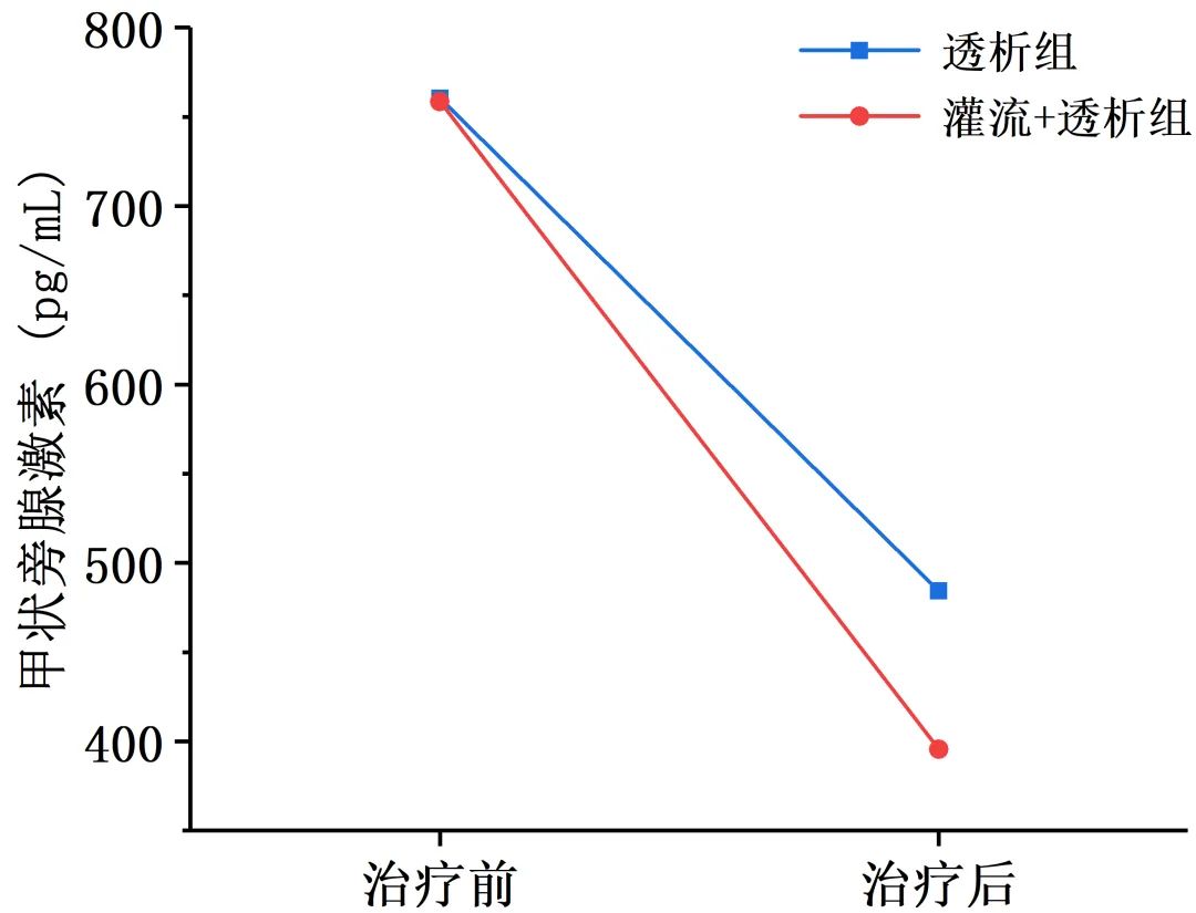 圖2 治療前后患者甲狀旁腺激素水平變化