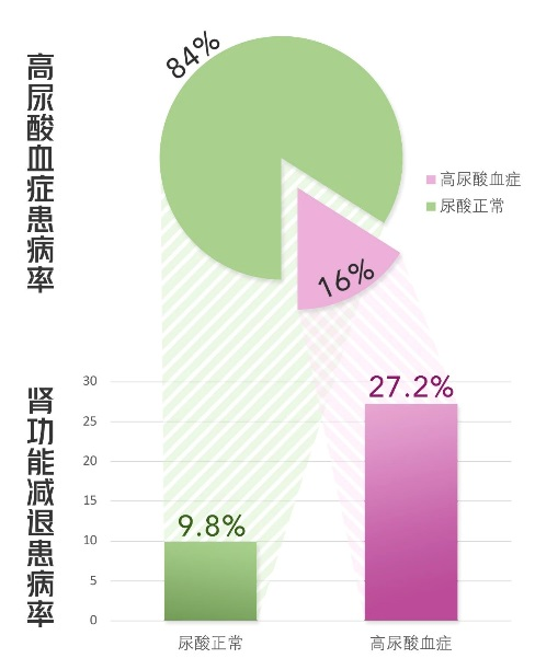 高尿酸血癥與腎功能息息相關。上海某醫院曾對我國8243名成年人進行了調查,其中1321例受訪者符合高尿酸血癥的診斷標準,其中有359名出現了腎功能減退,發病率高達27.2%;而其余6922例血尿酸正常的受訪者中僅有680例存在腎功能減退,發病率僅為9.8%。同時我們發現出現高尿酸血癥時越年輕,越有可能出現腎功能減退。